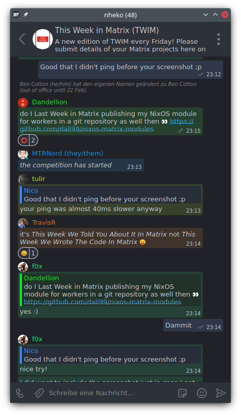 Well, I am assuming Malte was annoyed by that or similar reasons. But in the end, they did spend a lot of effort reorganizing the way Nheko layouts messages so that people can have bubbles. This should make Nheko feel much more at home on the PinePhone and it seems like they are doing even more to make Nheko a great experience on mobile devices! But just look at it yourself: